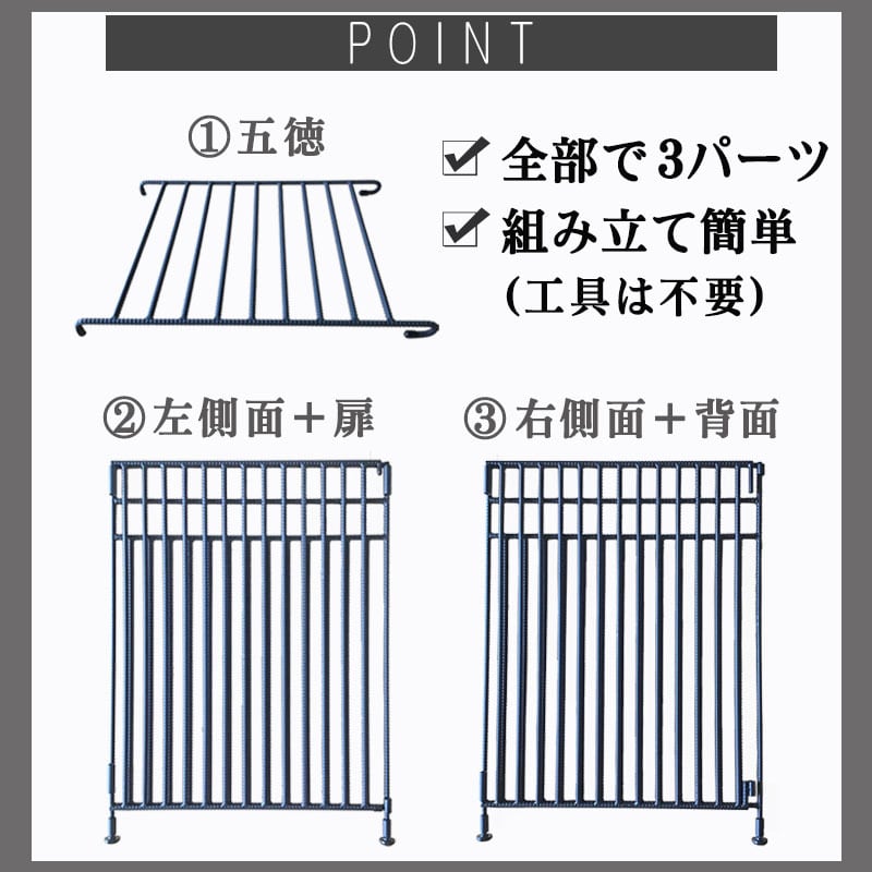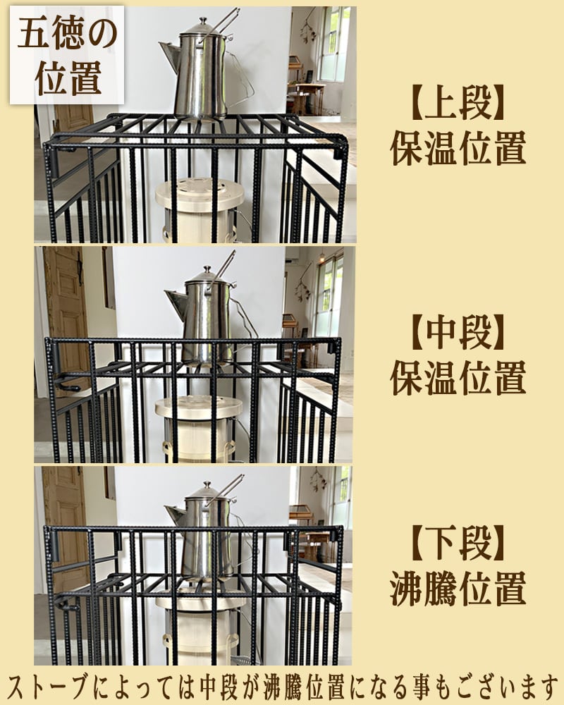 やかんなどが置ける便利な五徳付き!五徳の位置を変えることで、直火・保温等もできます。五徳の鉄筋間隔は40mm間隔なので小さめのやかん等でも安定して載せれます。